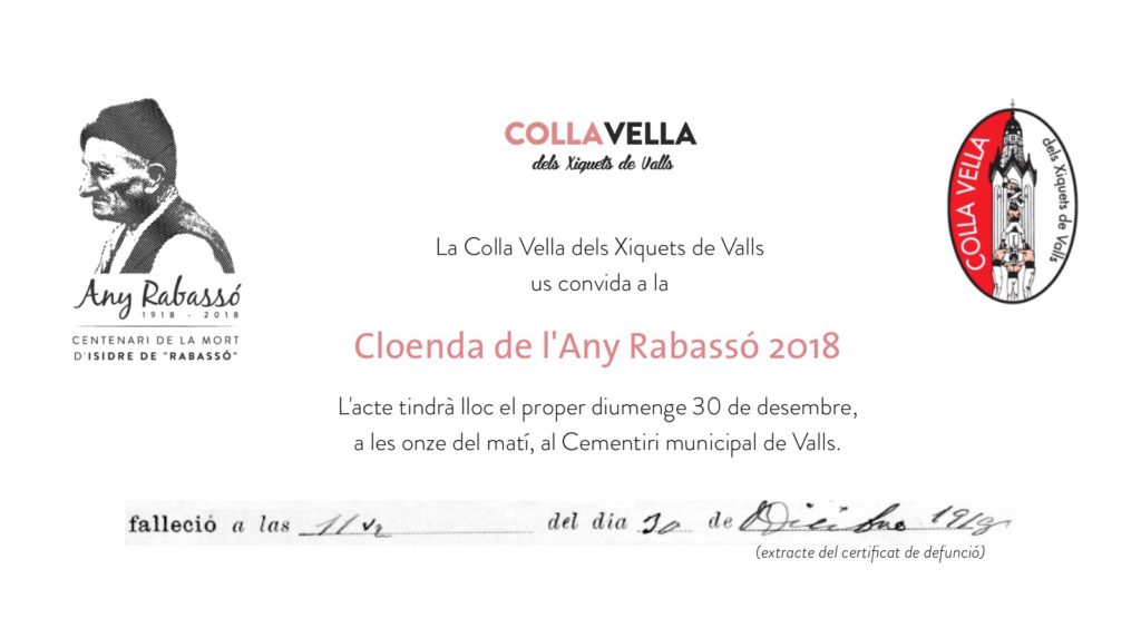 El proper diumenge 30 de desembre a les 11h la Colla Vella dels Xiquets de Valls tenim programat el darrer acte de l’Any Rabassó 2018, any que la Colla Vella hem dedicat a celebrar el centenari de la mort d’Isidre Tondo Ballart “Isidro de Rabassó”. Aquest importantíssim acte es basa en homenatjar la memòria de qui va ser casteller, i cap de colla de la Colla Vella dels Xiquets de Valls durant 43 anys consecutius (1875-1918) i es celebrarà al mateix dia i hora que va morir, amb cent anys de diferència, davant la sepultura que la Colla Vella té en propietat al cementiri municipal de Valls.